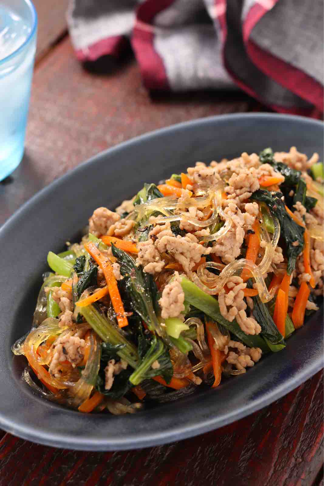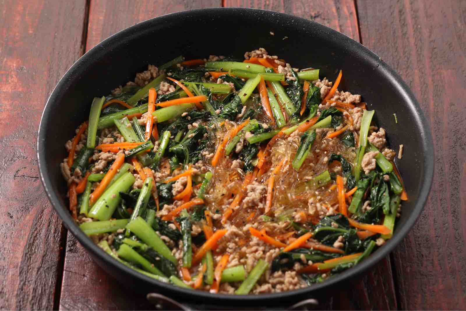 《小松菜のそぼろチャプチェ》