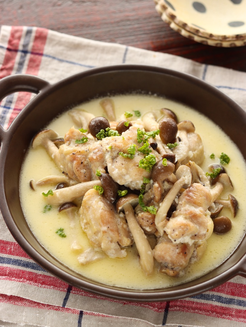 鶏肉を牛乳とにんにくを加えたソースで煮込んだ