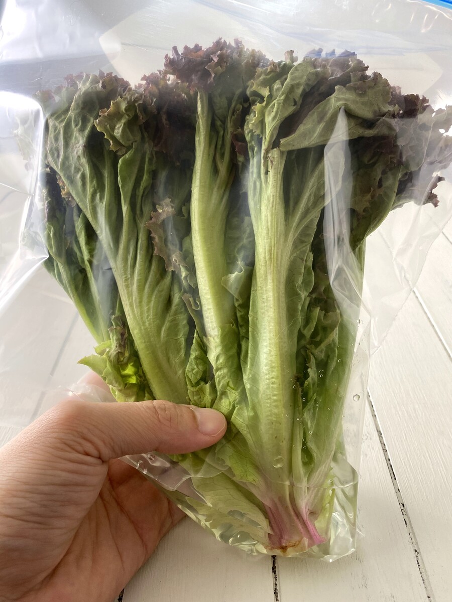 ジップロックなどの密閉袋に入れ、水を注ぐ。角の部分に水を溜め、芯が浸かるようにする。口を閉じ、野菜室に立てて保存。水は2〜3日に1回取り替え、芯も変色したら薄く切り落とす。