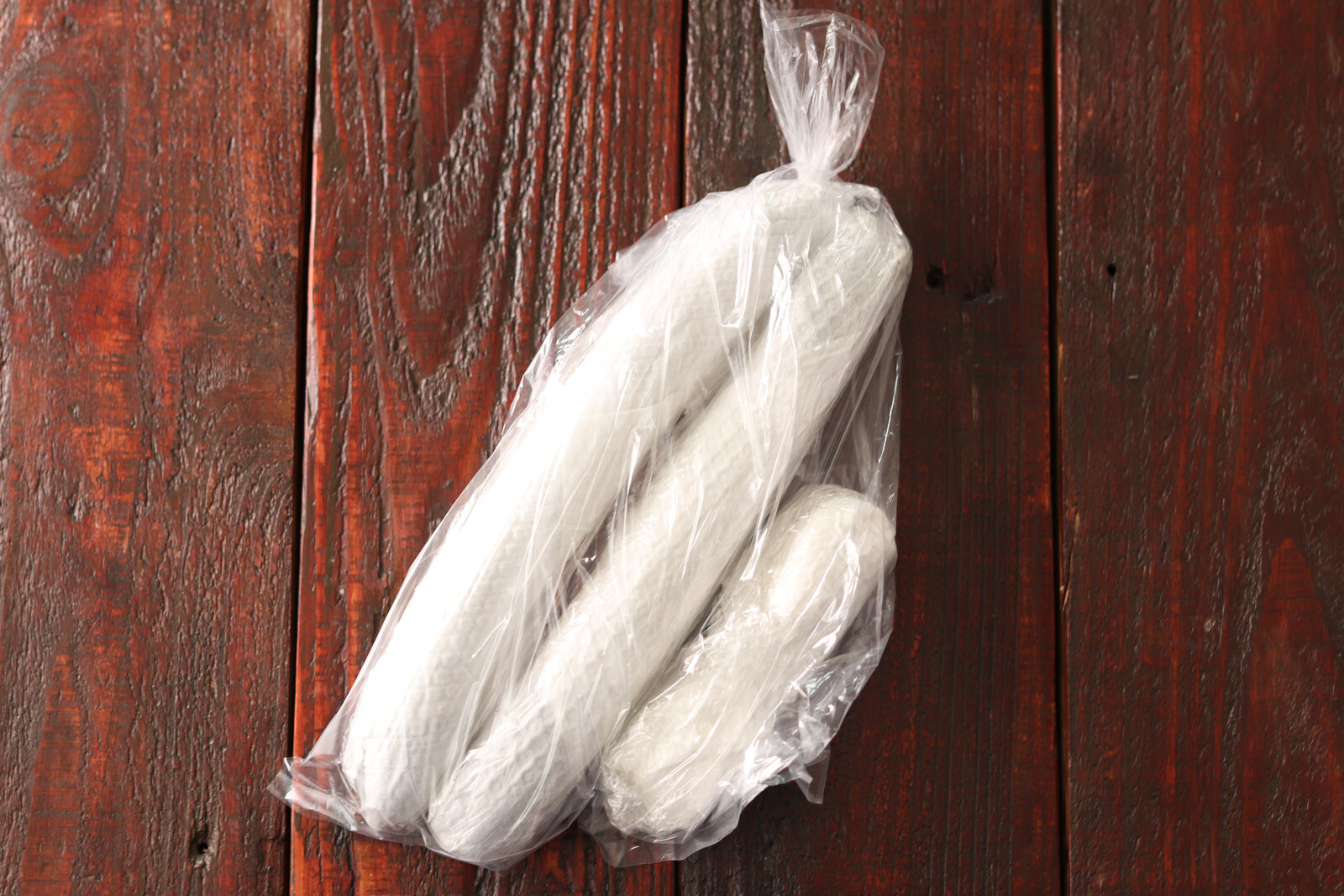 きゅうりの水気を拭き取り、1本ずつペーパータオルで包む。ポリ袋に入れて口を閉じ、立てて保存。