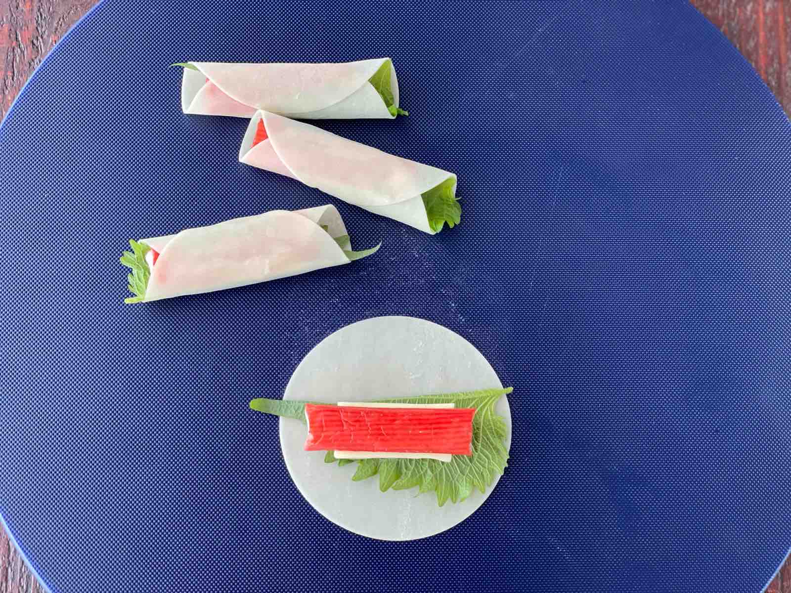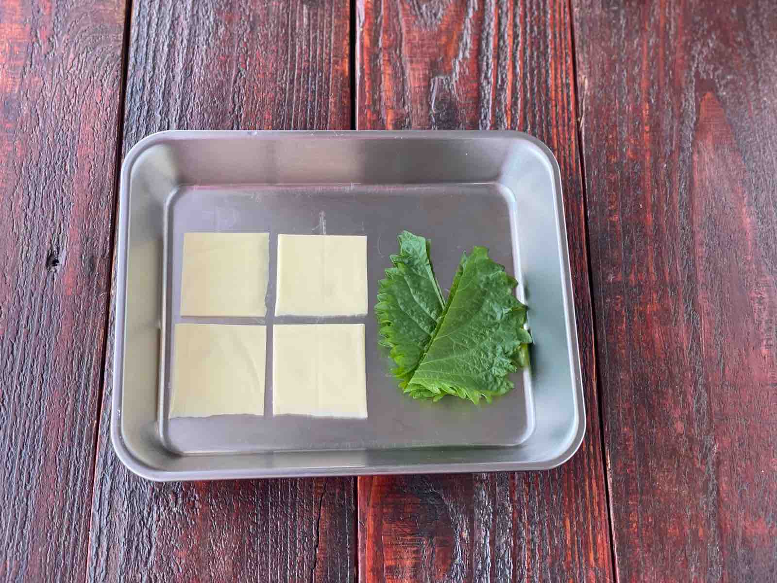 餃子の皮に青じそ・チーズ・カニカマを乗せ