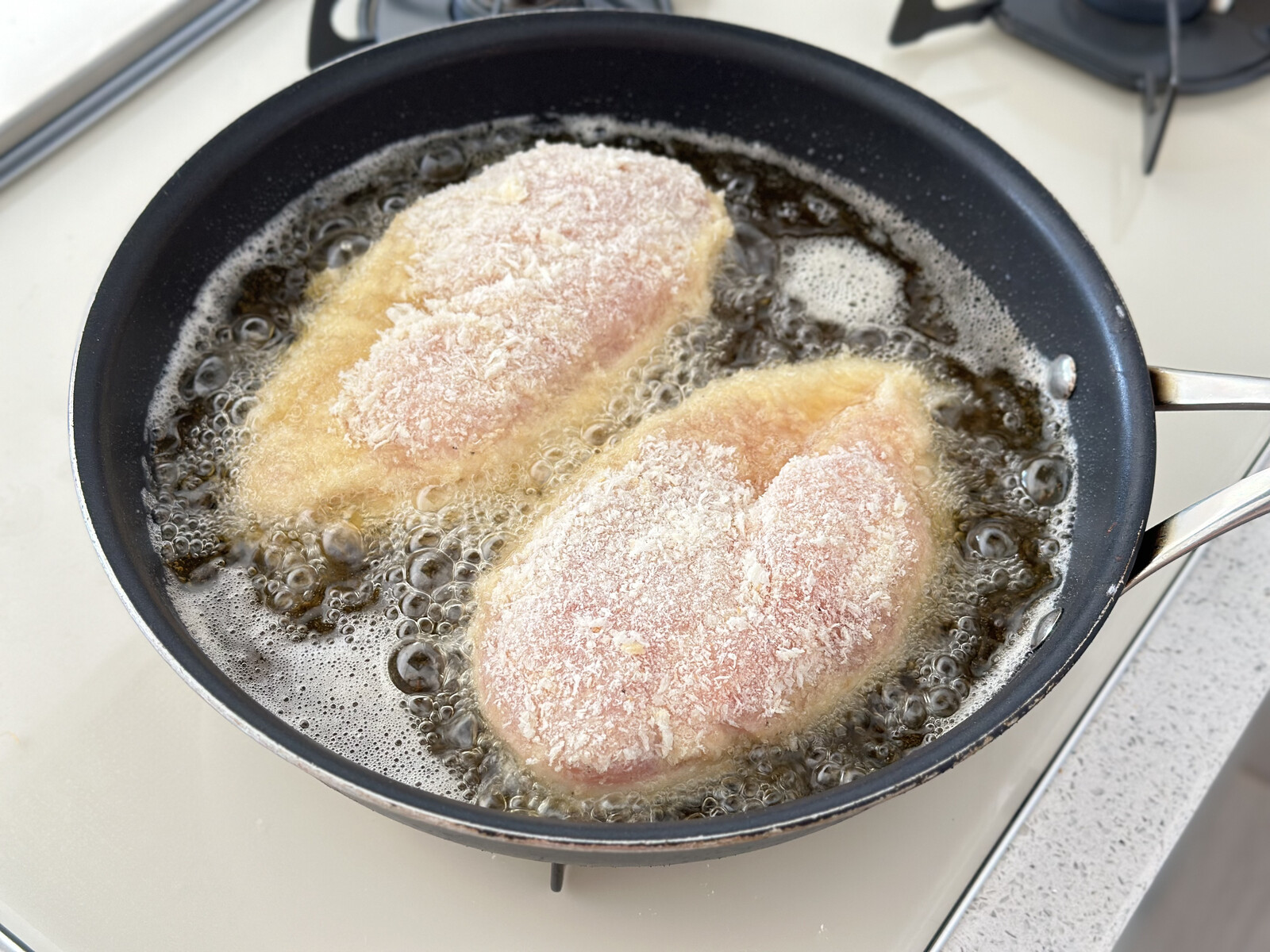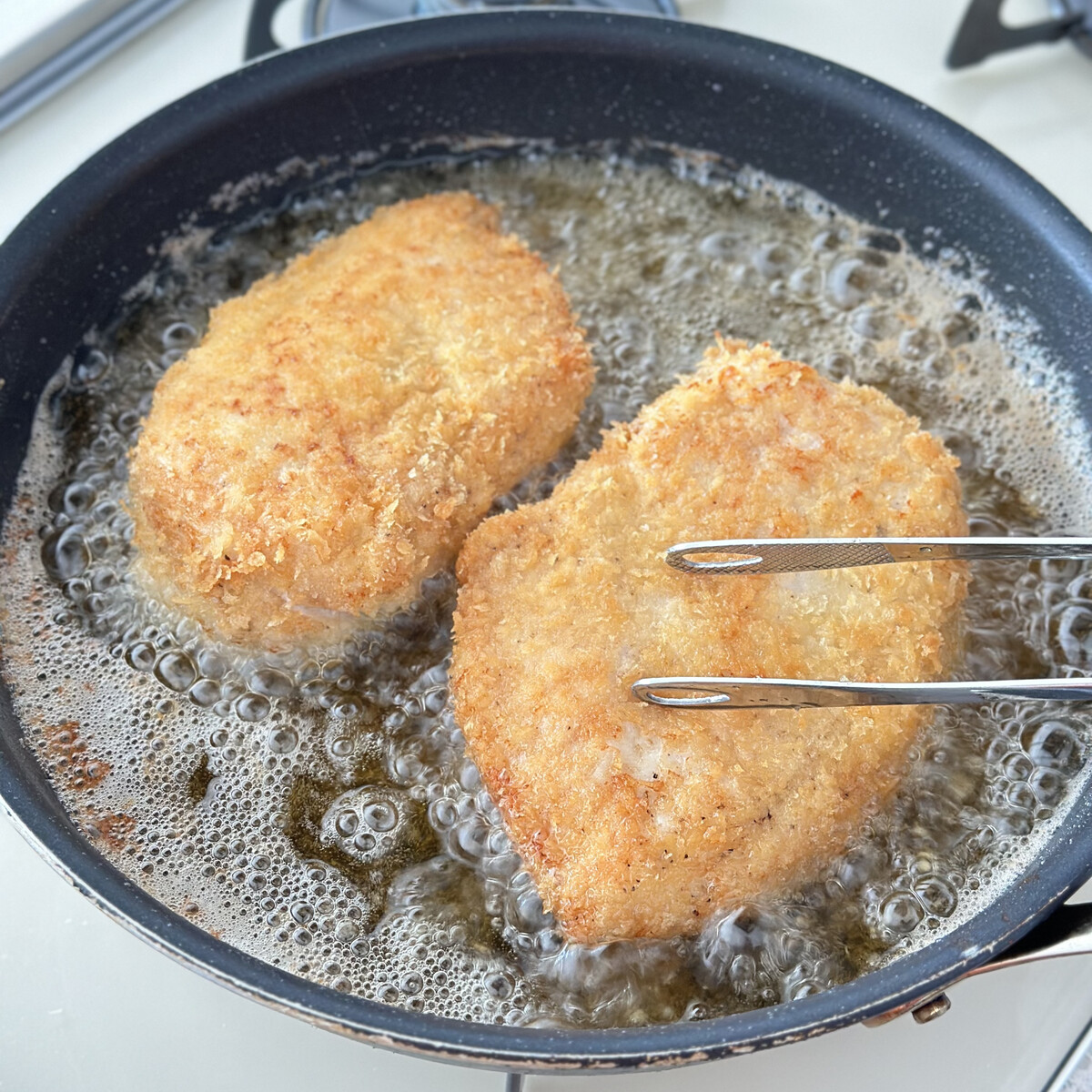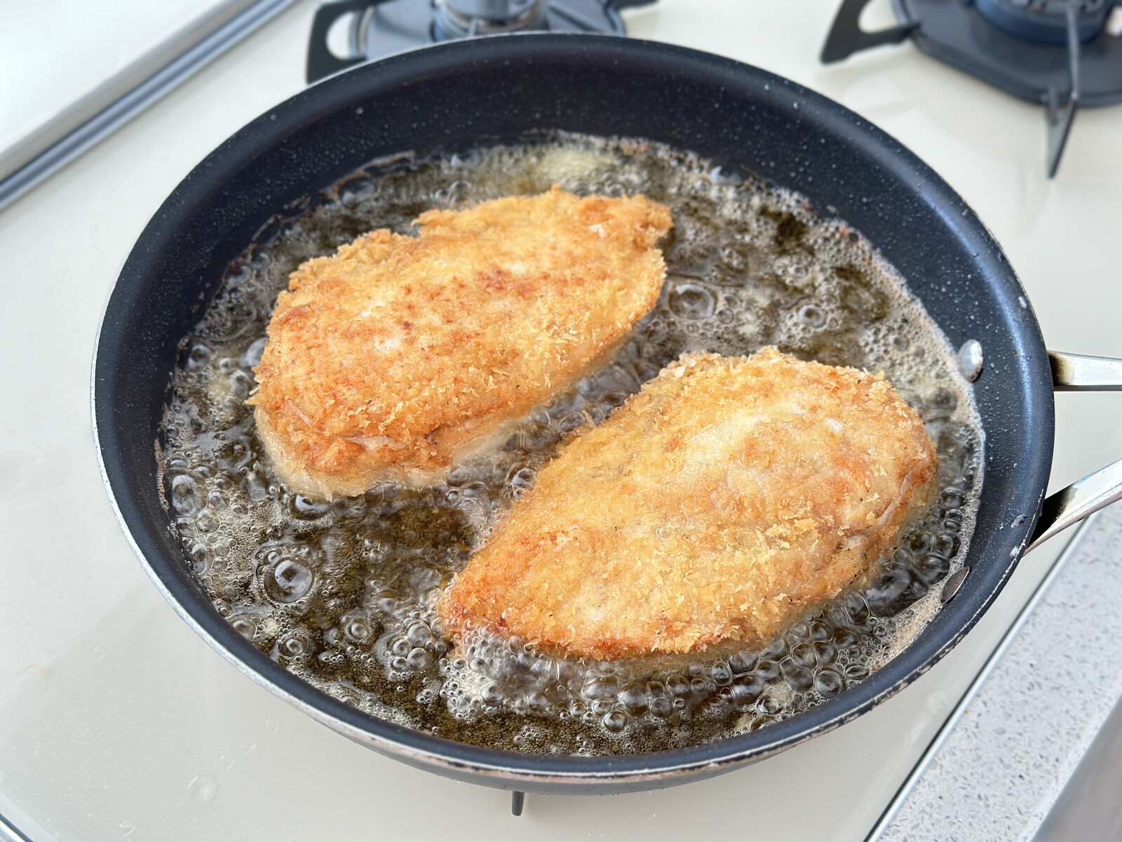 3.フライパンに深さ1cmの揚げ油を160℃に熱し、②を入れる。途中上下を返し、全体に火が通るまで10分ほど揚げ焼きし、油をきる。