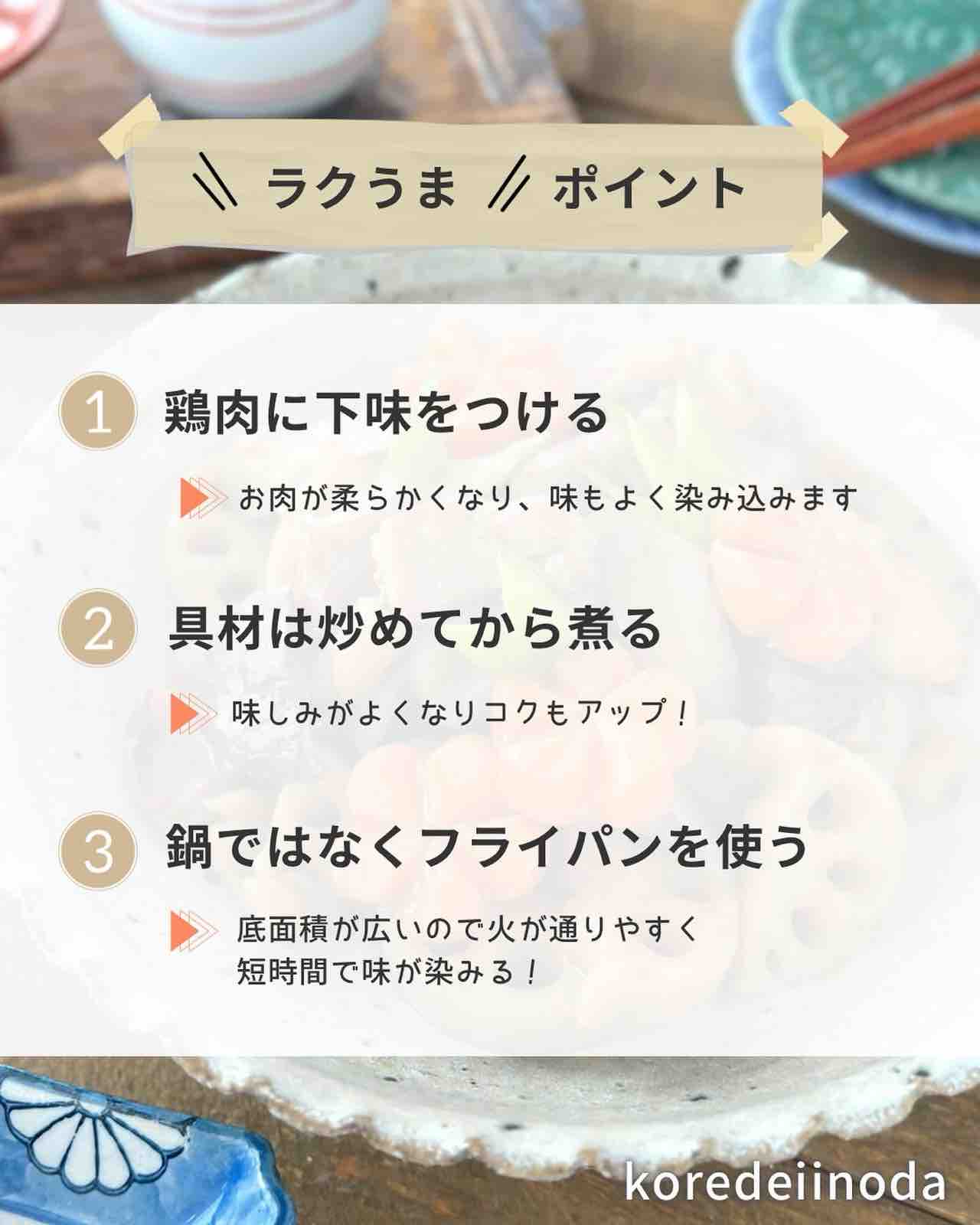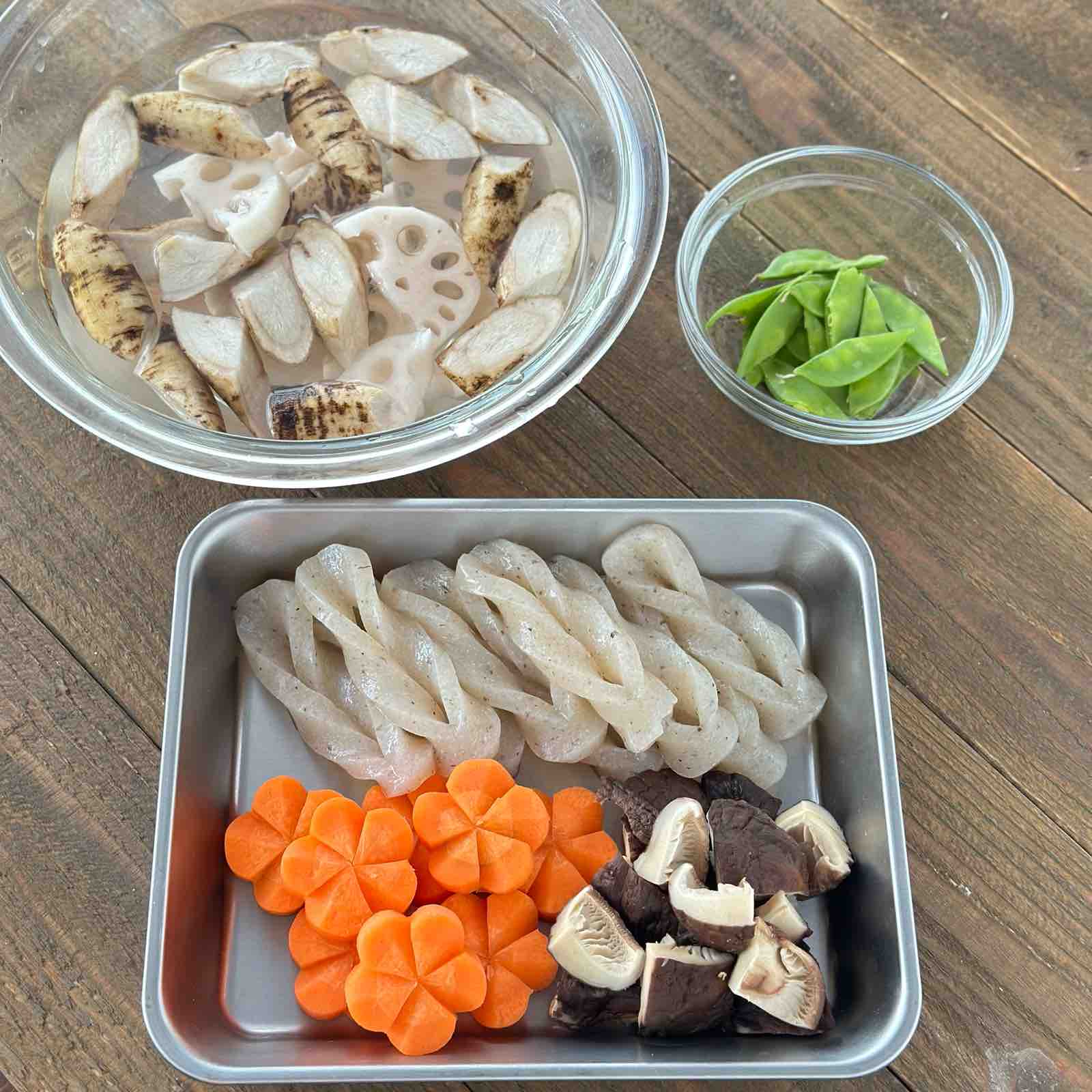 1.鶏肉は小さめのひと口サイズに切り、〔⚪︎〕を揉み込む。れんこんは1cm厚さの半月切り・ごぼうは乱切りにし、水に5分ほどさらす。にんじんは花形(乱切り)にする。板こんにゃくは5mm厚さに切って中央に切れ目を入れ、片端を穴を通す(手綱こんにゃく )。干し椎茸は戻して4等分に切る。絹さやは筋を取り、斜め半分に切る。