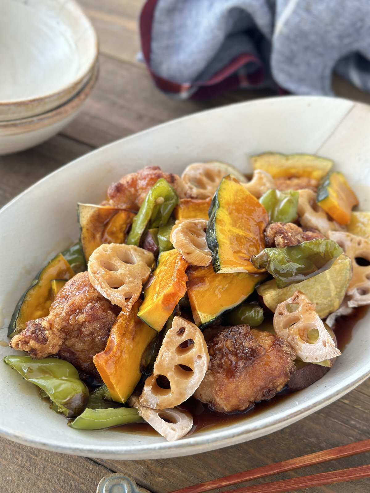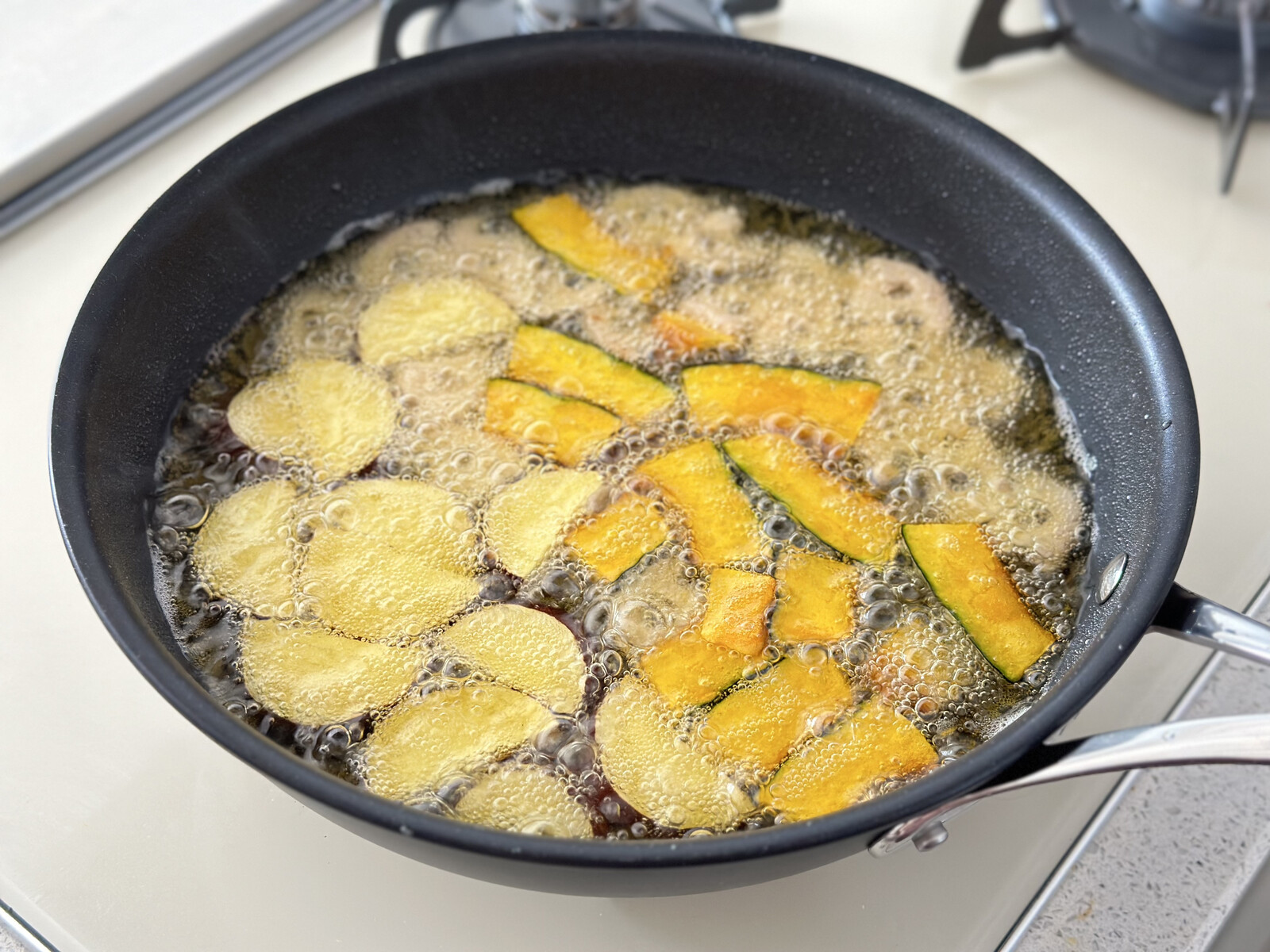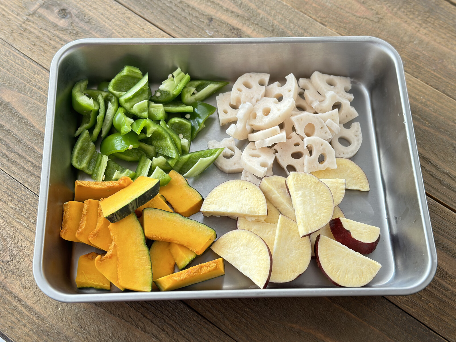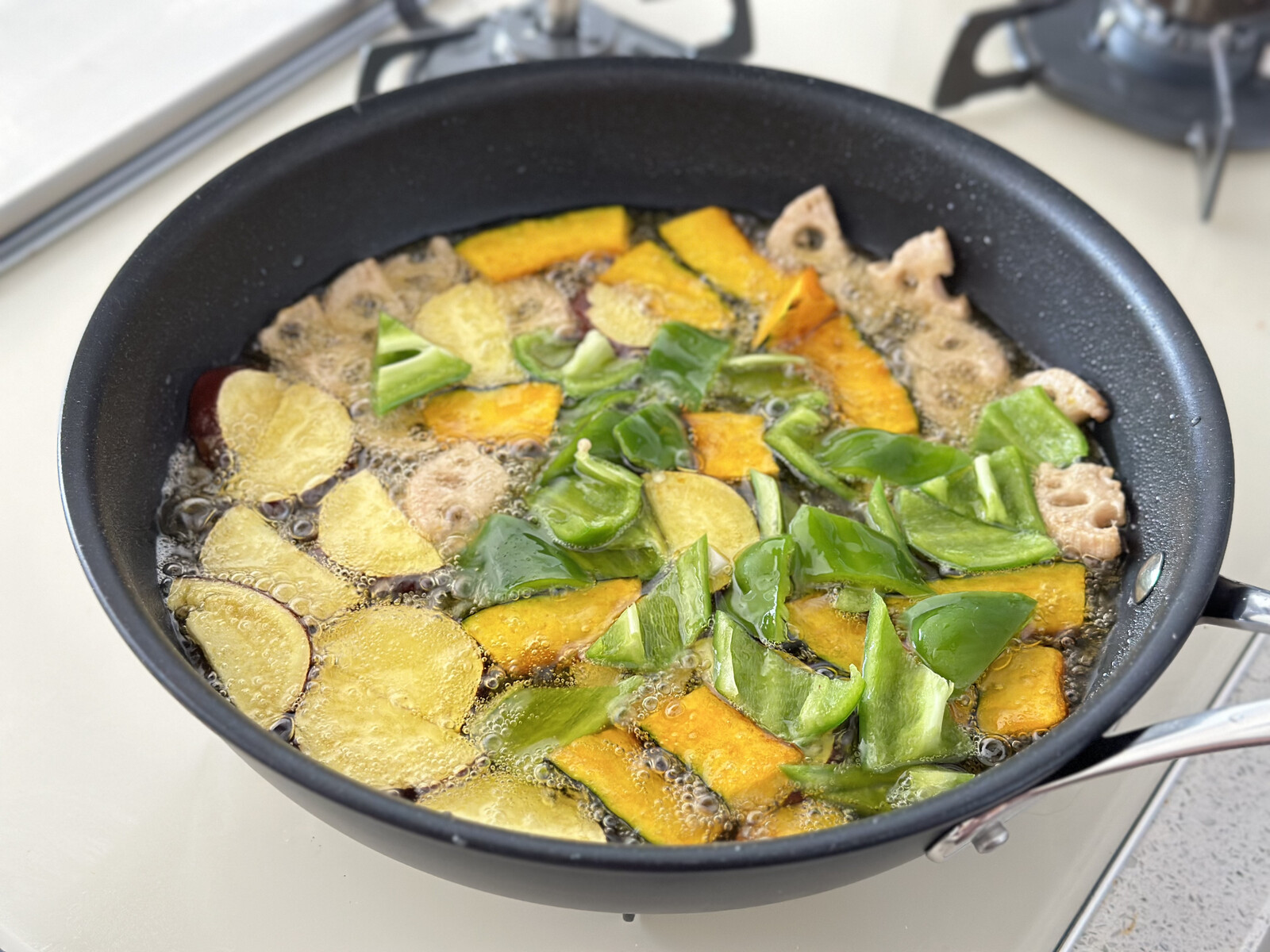 1.さつまいもとれんこんは1cm幅の半月切りにし(大きければイチョウ切りにする)、水に5分ほどさらす。かぼちゃは7〜8mm厚さに切り、長さを半分にする。ピーマンはひと口サイズの乱切りにする。