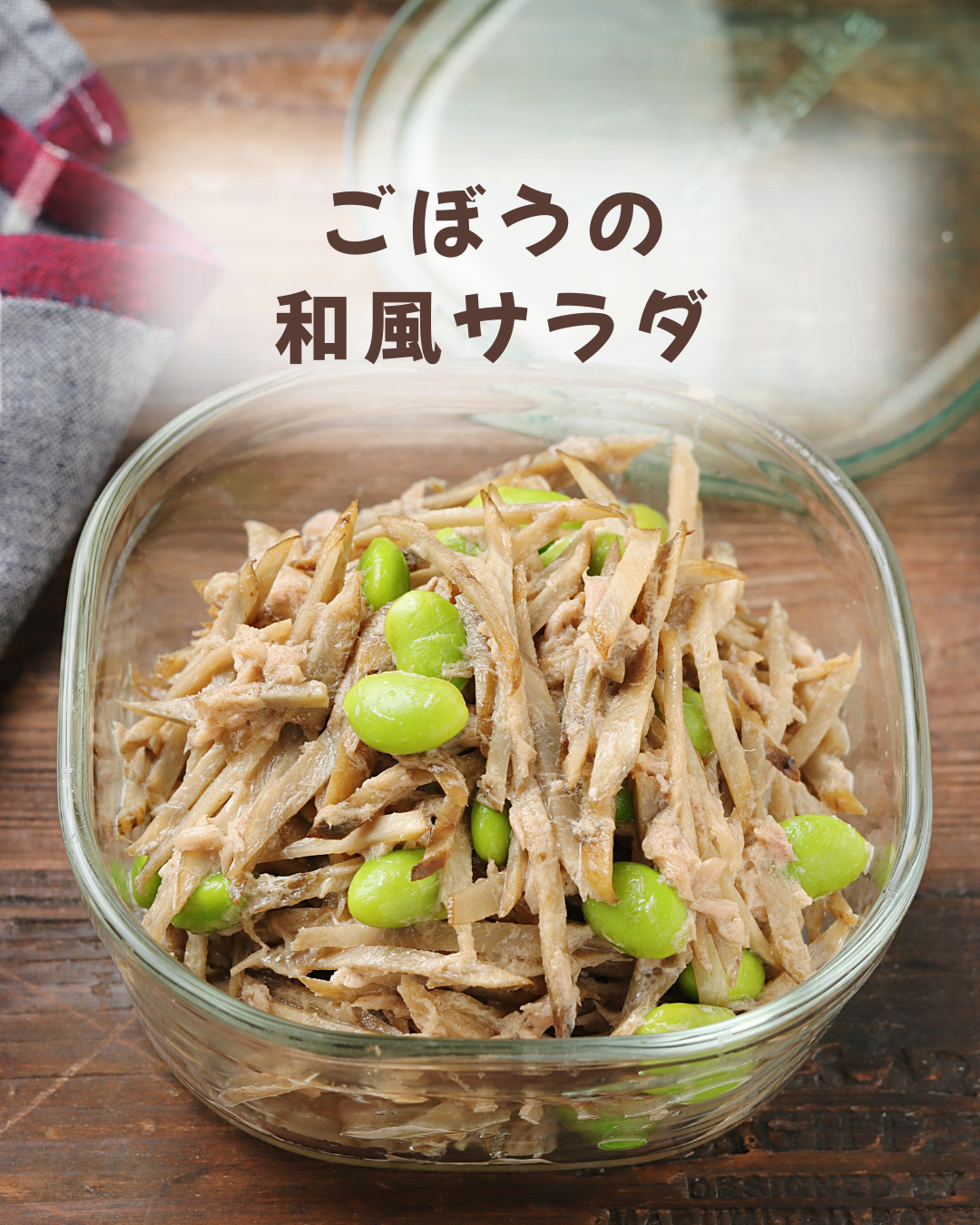 2.耐熱容器に水気を切ったごぼう・〔⚪︎〕・ツナ缶の油を入れ、ふんわりラップをして、レンジ600wで3分ほど加熱する。サッと混ぜ合わせて粗熱を取る。