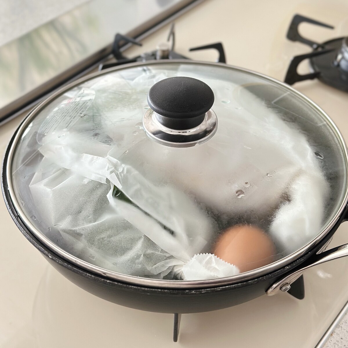 中火で5分蒸す(鶏肉)→卵を加えて5分蒸す
